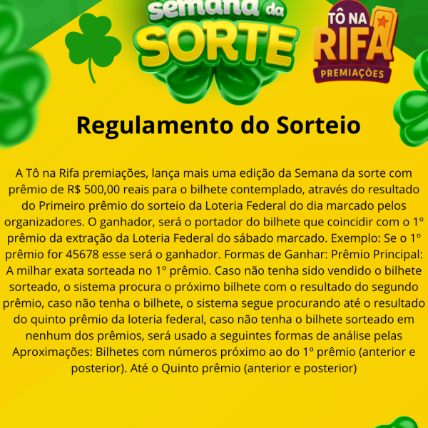 A Tô na Rifa premiações, lança mais uma edição da Semana da sorte com prêmio de R$ 500,00 reais para o bilhete contemplado, através do resultado do Primeiro prêmio do sorteio da Loteria Federal do dia marcado pelos organizadores.