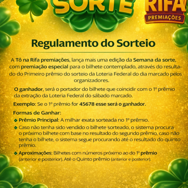 A Tô na Rifa premiações, lança mais uma edição da Semana da sorte, com premiação especial para o bilhete contemplado, através do resultado do Primeiro prêmio do sorteio da Loteria Federal do dia marcado pelos organizadores.